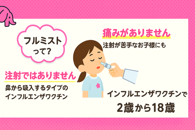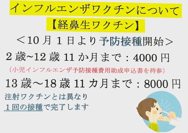 対象は2歳〜18歳まで 8,000円 (税込)・経鼻生ワクチン(フルミスト) 1回接種で完了です。