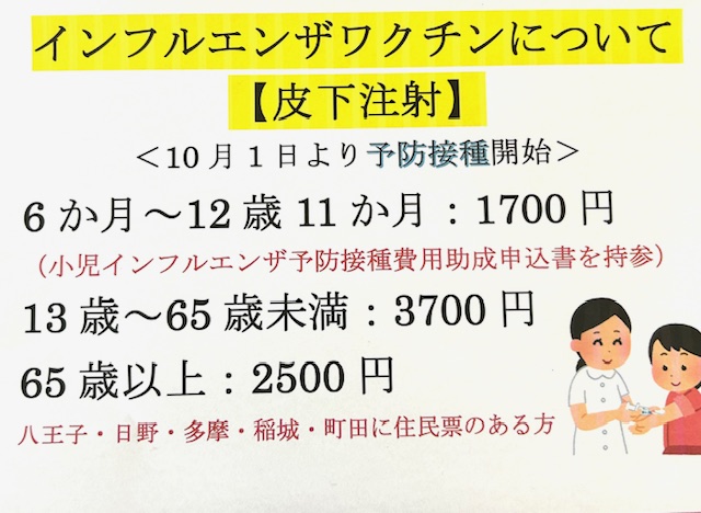 八王子市在中で2歳〜12歳11ヵ月まで、小児インフルエンザ予防接種費用助成申込証をお持ちの方: 4,000円(税込)